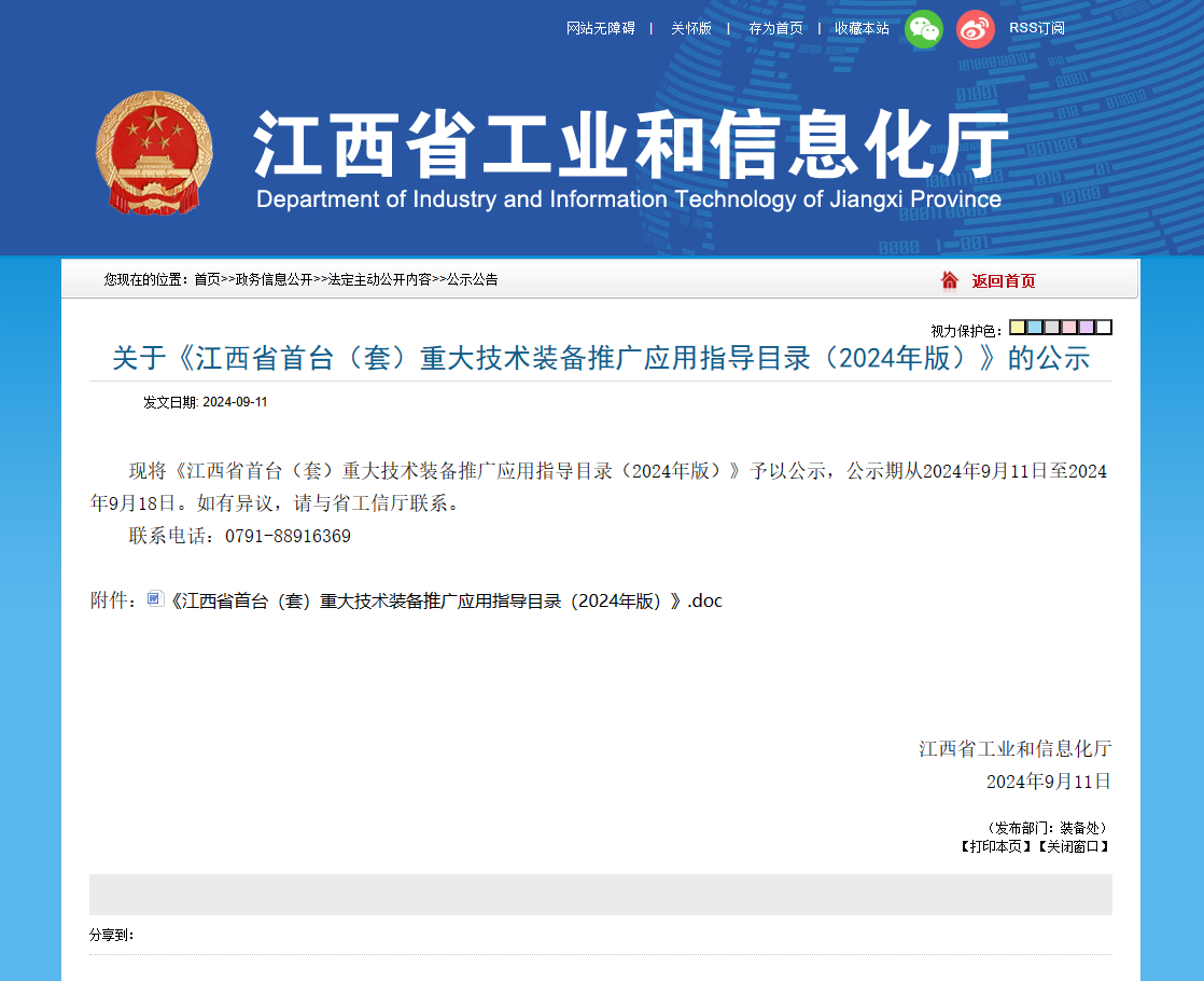 2024年9月11日江西東銳智能裝備科技股份有限公司獲得關(guān)于《江西省首臺(tái)(套)重大技術(shù)準(zhǔn)備推廣應(yīng)用指導(dǎo)目錄(2024年版)》的公示
