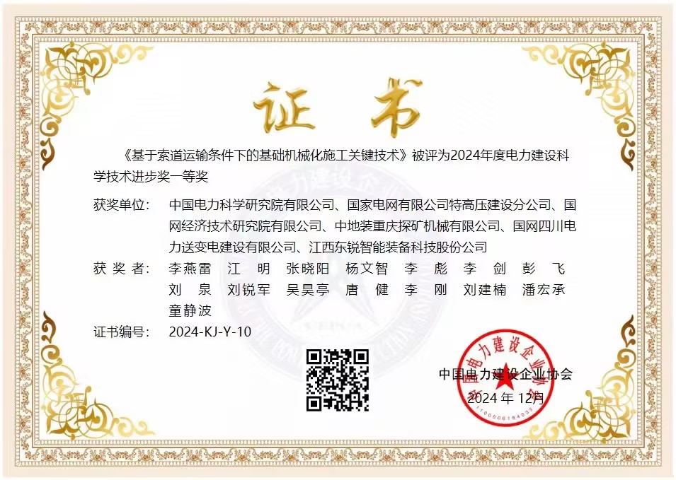 《基于索道運(yùn)輸條件下的基礎(chǔ)機(jī)械化施工關(guān)鍵技術(shù)》被評(píng)為2024年度電力建設(shè)科學(xué)技術(shù)進(jìn)步獎(jiǎng)一等獎(jiǎng)。