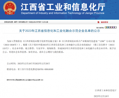 2023年12月19日,東銳取得了關(guān)于2023年江西省信息化和工業(yè)化融合示范企業(yè)名單的公示...