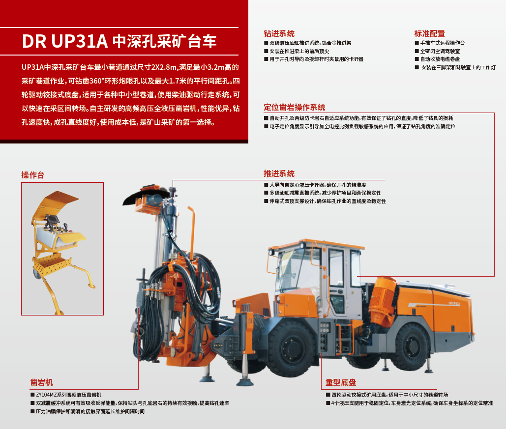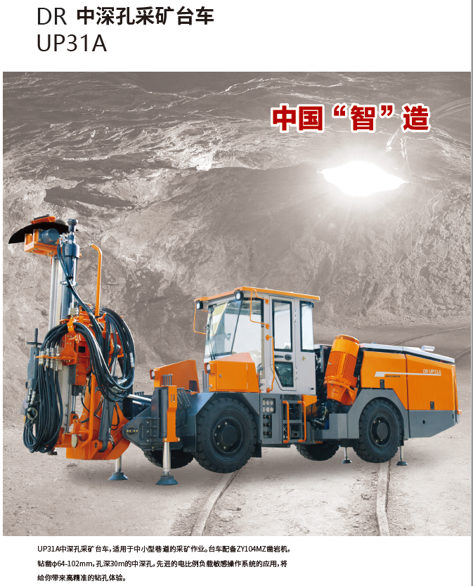 UP31A中深孔采礦臺車,適用于中小型巷道的采礦作業(yè)。臺車配備ZY104MZ鑿巖機(jī),鉆鑿φ64-102mm,孔深42m的中深孔,先進(jìn)的電比例負(fù)載敏感操作系統(tǒng)的應(yīng)用,將給你帶來高精準(zhǔn)的鉆孔體驗。