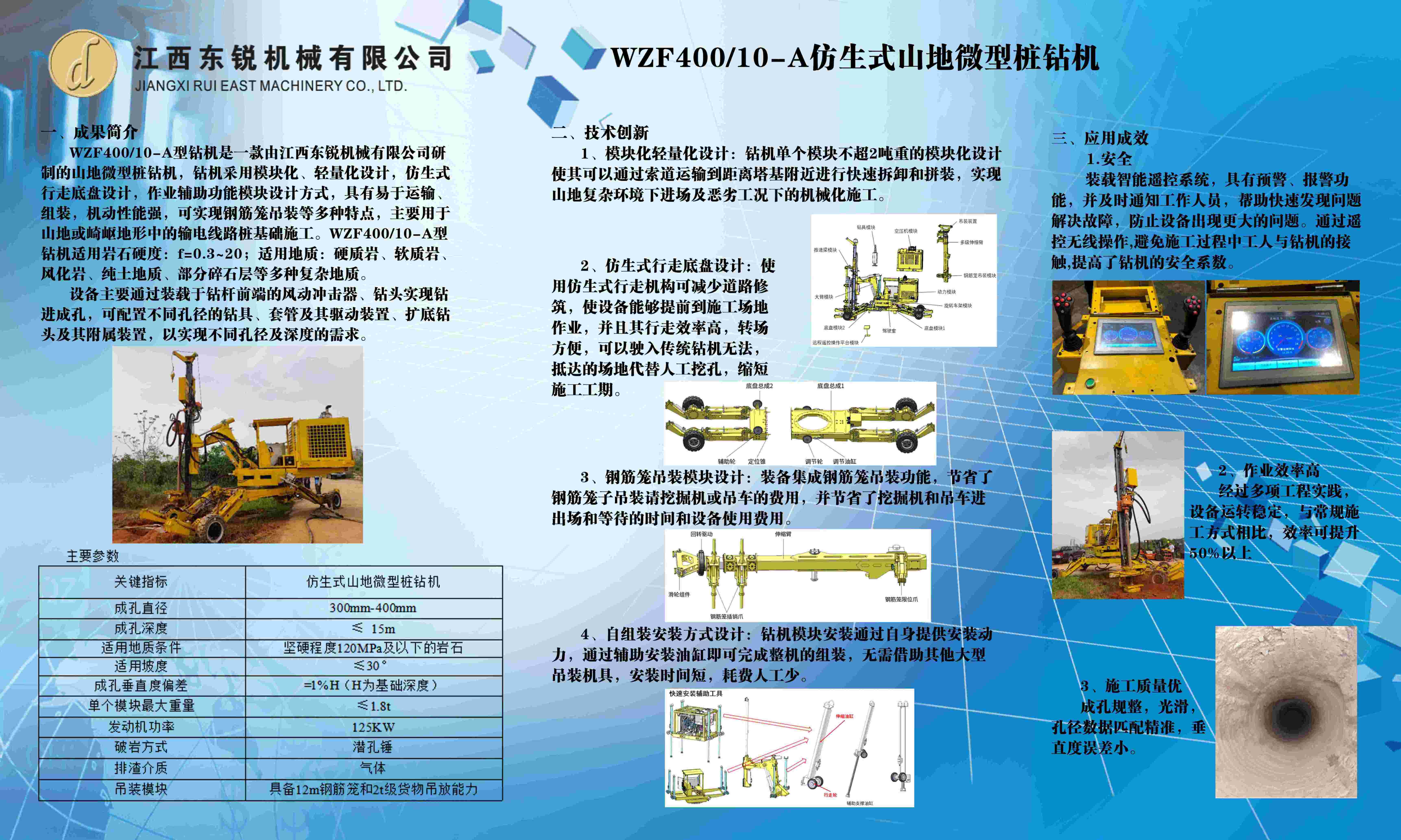 2023年05月23日,國網(wǎng)特高壓公司在江西東銳智能裝備科技股份有限公司試驗(yàn)場地召開了 “WZF400/10-A型仿生式山地微型樁鉆機(jī)主要性能測試”專家見證會,參會專家對WZF400/10-A型仿生式山地微型樁鉆機(jī)是否滿足索道運(yùn)輸條件、最大單軸飽和抗壓強(qiáng)度下鉆機(jī)性能、成孔質(zhì)量以及鋼筋籠吊裝模塊是否具備12m鋼筋籠和2t級貨物吊放能力等主要指標(biāo)要求進(jìn)行了見證與討論。